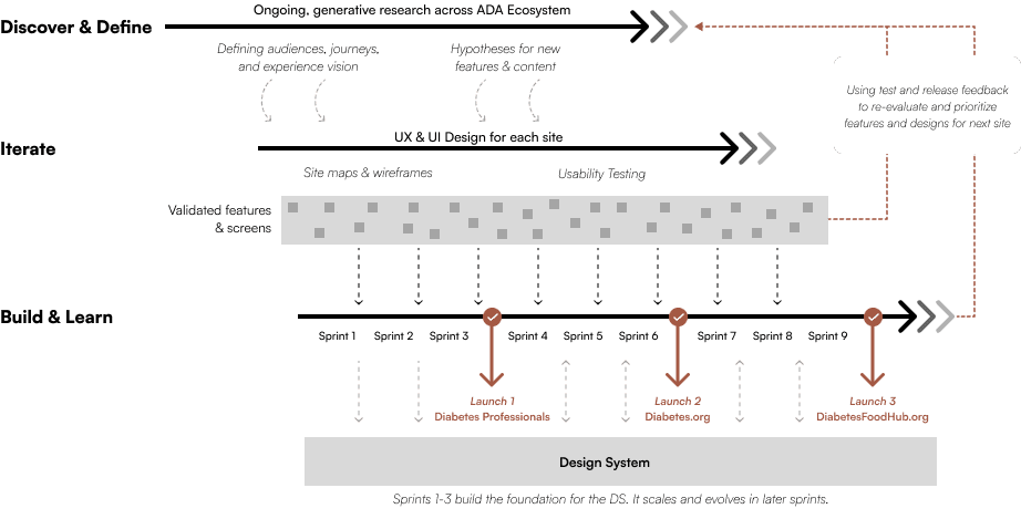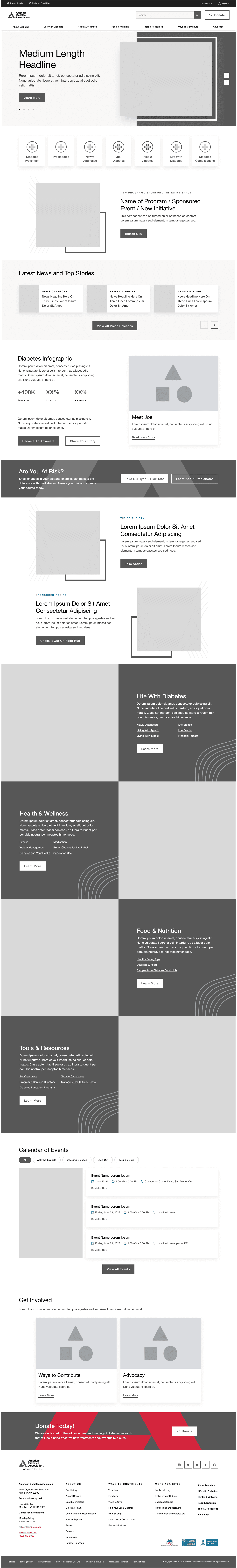 I approached the redesign of three ADA websites as a unified system, starting with the Diabetes Professional site to establish shared patterns, components, and stakeholder alignment. As that site moved into testing, I initiated design work on the next two. This holistic, parallel approach allowed teams to share insights in real-time, reduce redundancy, and accelerate delivery while maintaining quality and a user-centered focus across all three experiencs.