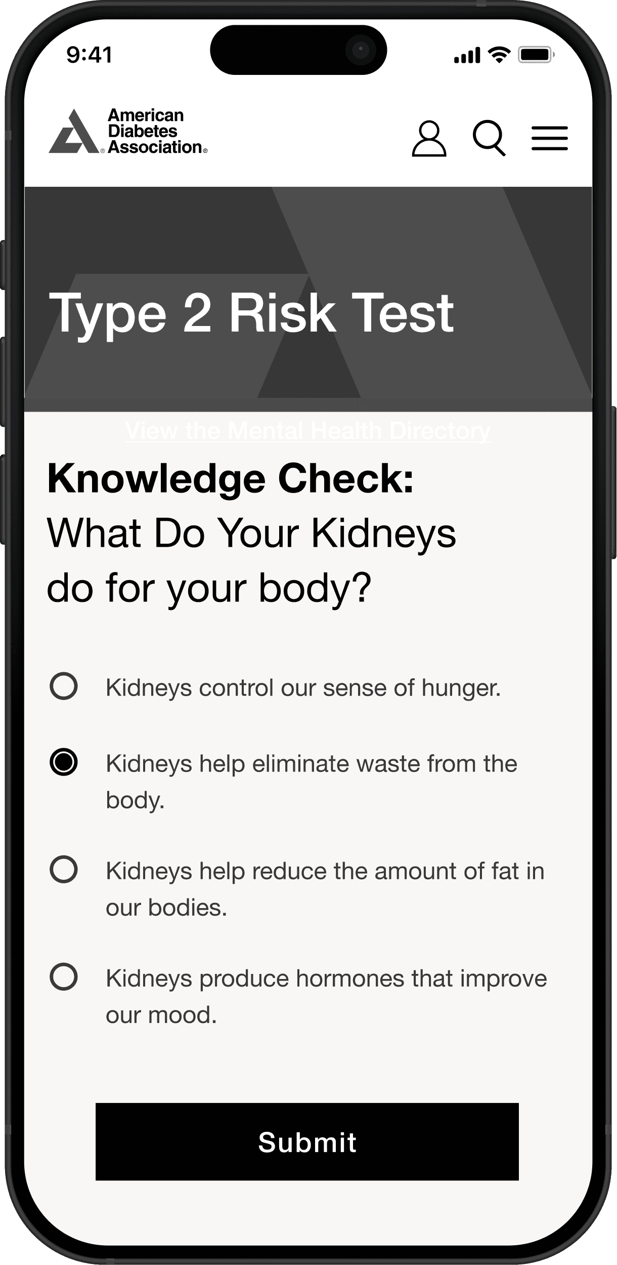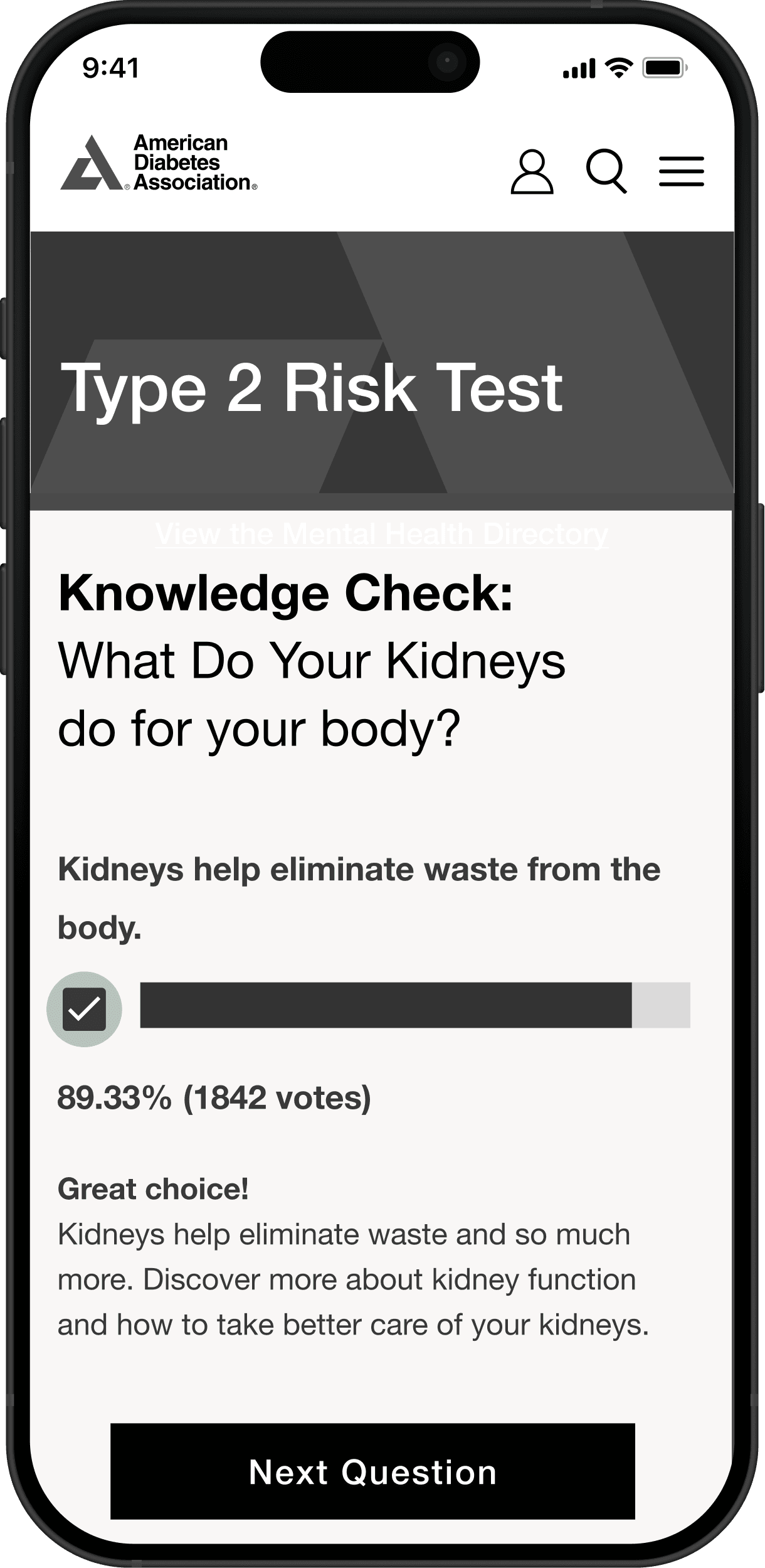 We created a new interactive quiz experience that uses knowledge checks and personalized feedback to educate users and motivate action against Type 2 diabetes.