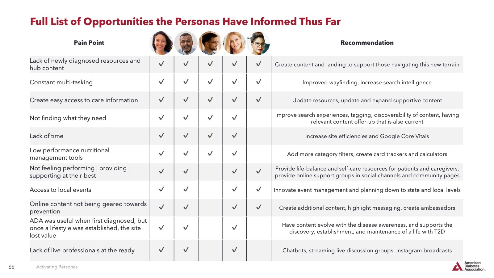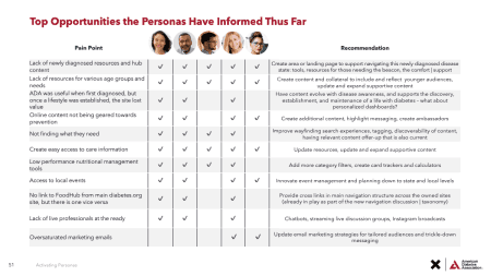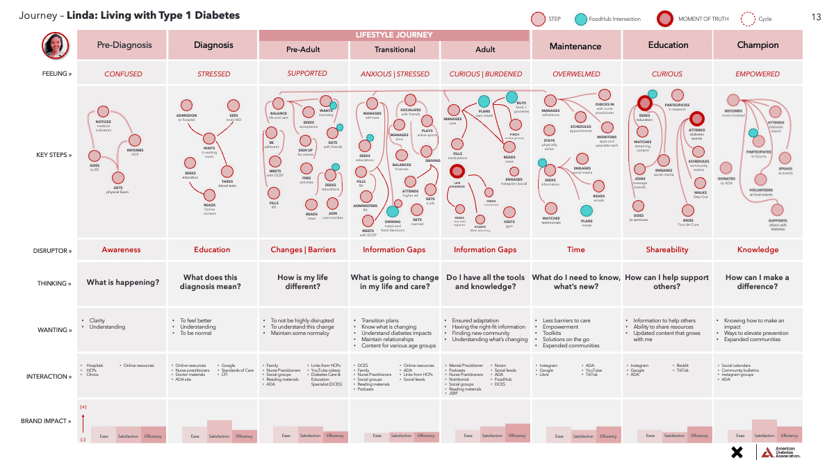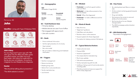 Our discovery process involved understanding the ADA's key audiences, business, technology, and internal barriers. Insights from research helped us define a vision for the ADA's digital ecosystem along with key audience personas and journeys.