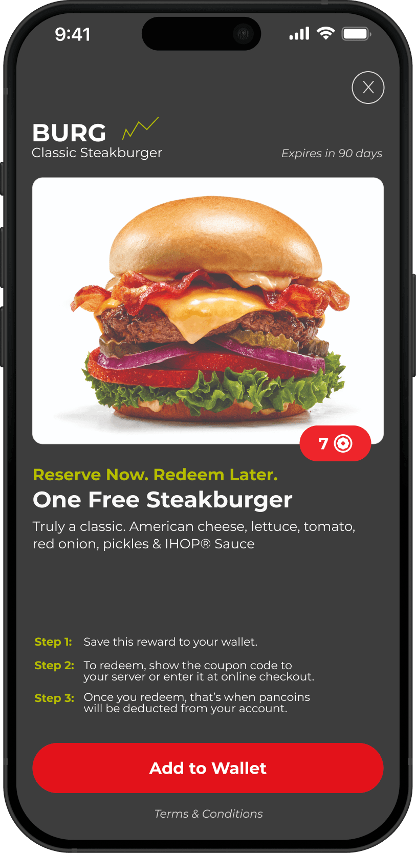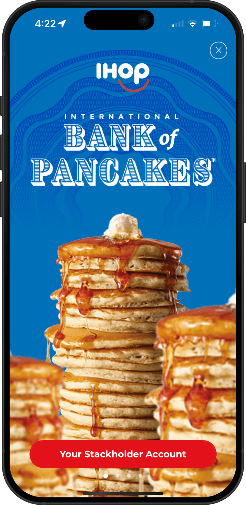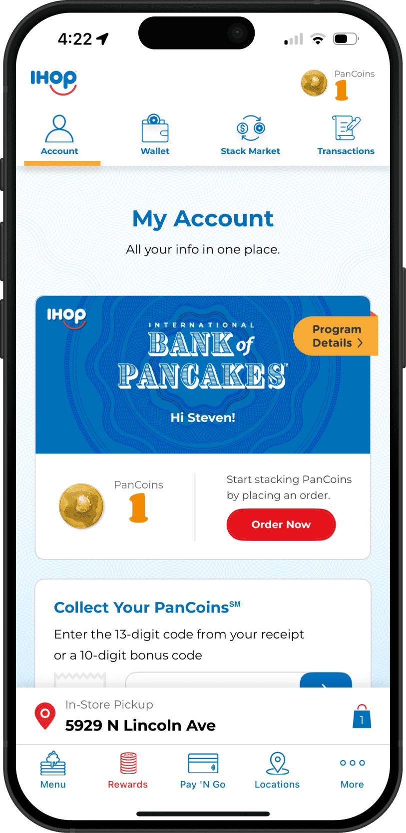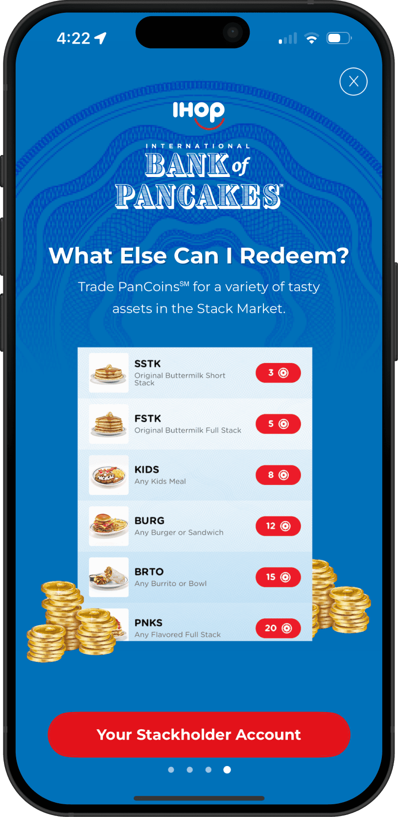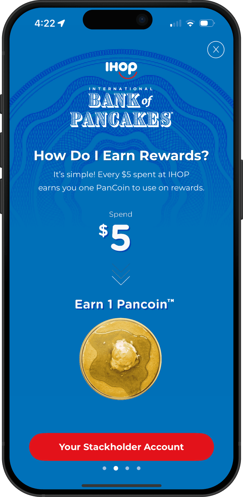 We created an engaging, bank/crypto-themed loyalty program that makes it easy and fun to sign up, earn, and use pancoins (points). The dashboard provides guests with a quick view of their "account" and clear paths to common actions.