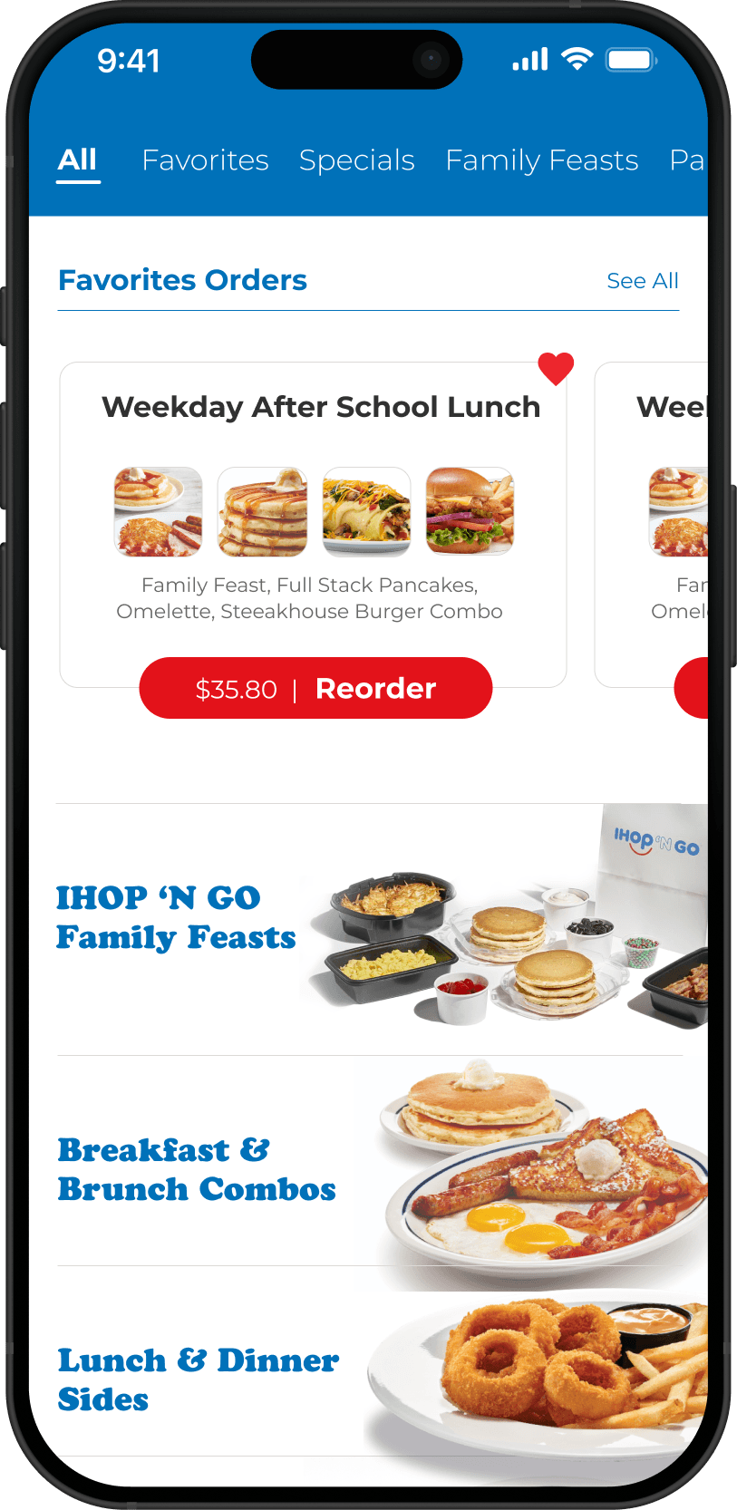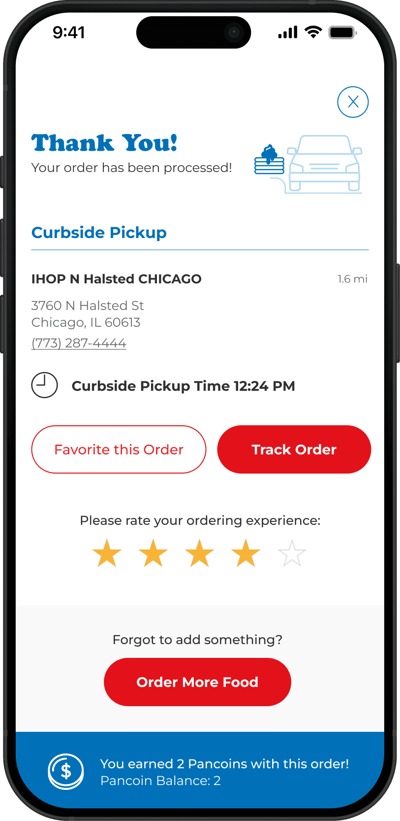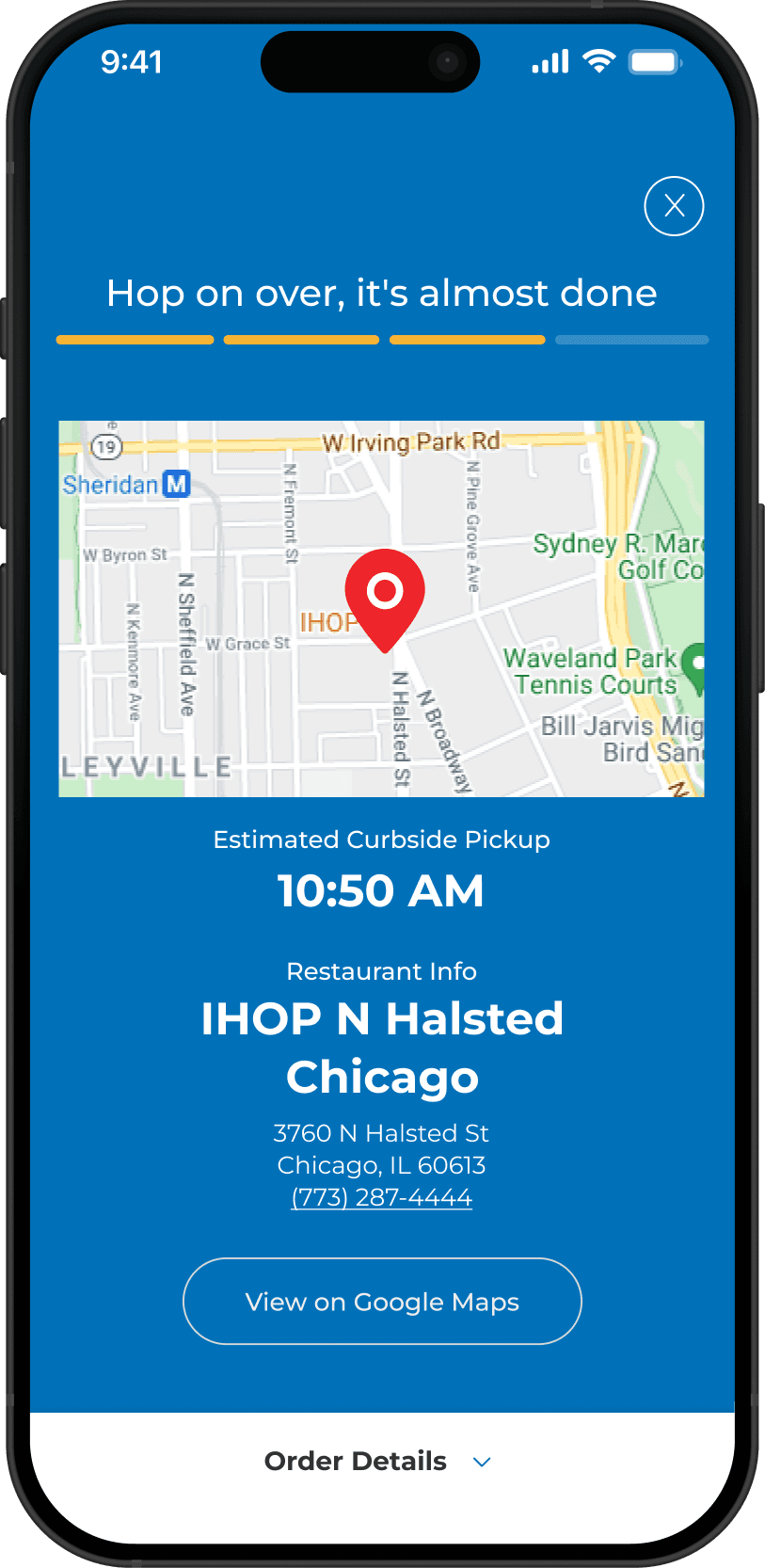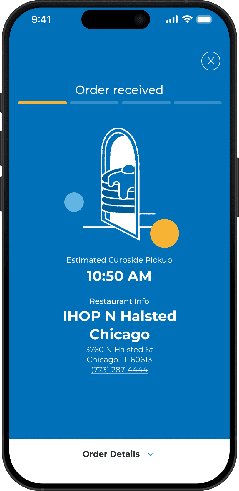 A great ordering experience also lets you know when to pick up your order. I spearheaded the strategy and UX design to enhance the order status experience, helping busy families know when to leave home and for IHOP servers to meet customers in the parking lot with their order.