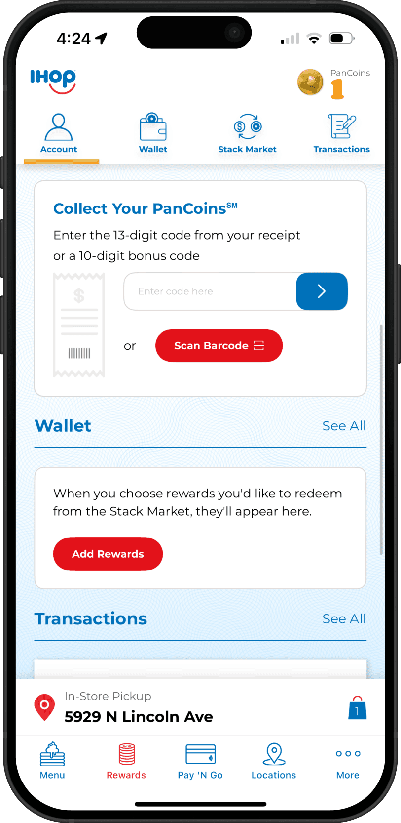 For dine-in guests, our new UX lets them to scan a code on their receipts to earn pancoins, ensuring they never miss out on rewards they’ve earned.