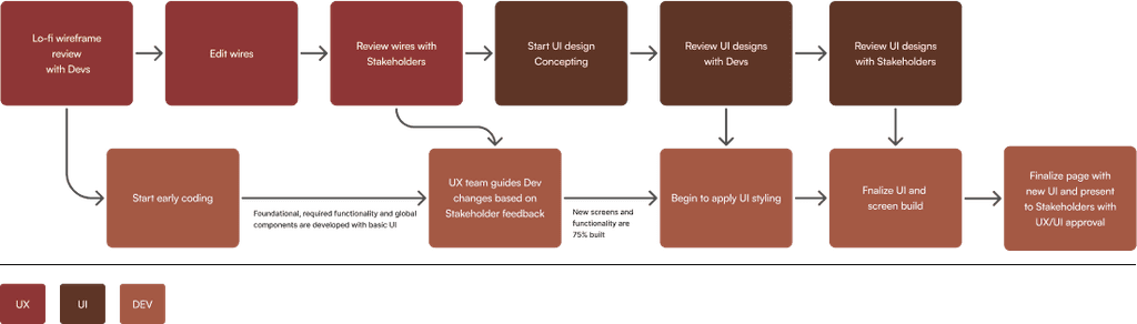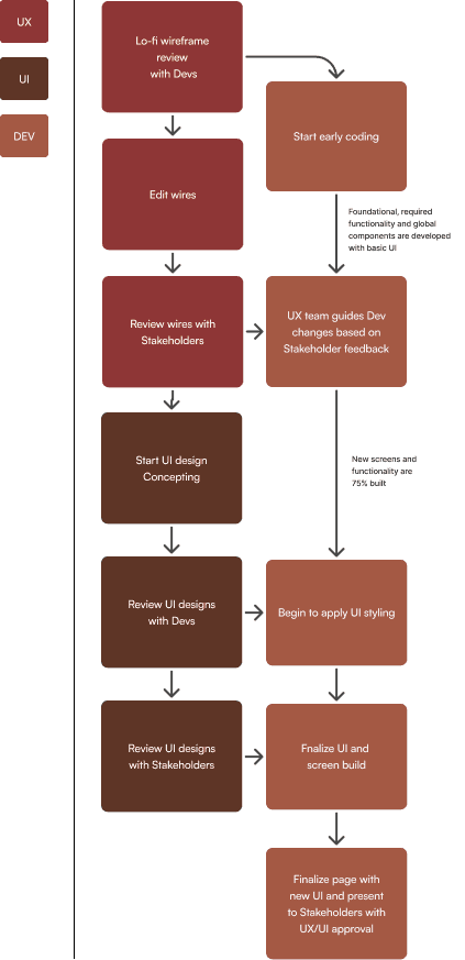 With our design team in Chicago, developers in India, and stakeholders in Los Angeles, we held twice-weekly working sessions and shared in-progress Figma files to stay aligned, gather feedback in real time, and kick off development early each sprint. This approach accelerated team velocity, minimized rework, and reduced the need for multiple rounds of iteration on each wireframe and UI design to get to development faster.